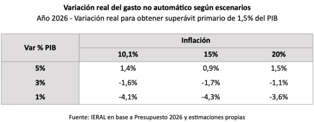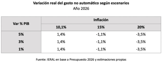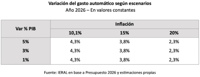 La porción del gasto que se mueve automáticamente con la inflación (con dos meses de rezago) exhibirá una variación acorde al escenario elegido para la inflación (nivel y secuencia). Así, dichas erogaciones tendrán un aumento real anual del 4,3% en el escenario del proyecto de presupuesto, pero dicho incremento real resultará inferior si la tasa de inflación finalmente es menor. Por caso, con una inflación del 20% anual y suba del PIB del 3%, las erogaciones automáticas aumentarían un 2,3% real en 2026.