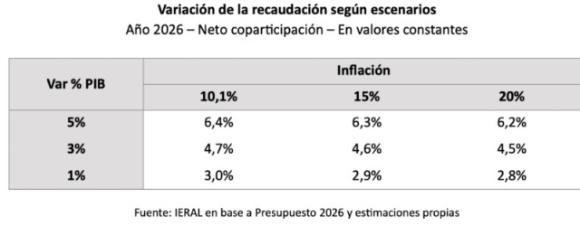 Con relación a la recaudación, en la medida que sube la inflación resulta mayor el aumento nominal pero inferior la suba real, y a medida que la economía crece más, mayor resulta el incremento de los recursos, tanto nominales como reales. Así, por ejemplo, con una inflación de 10,1% y aumento del PIB del 5%, la recaudación real (neta de coparticipación) subiría 6,4% anual, pero si la inflación resultara finalmente del 20% con un incremento del PIB del 1%, los recursos aumentarían en torno a 2,8% real.