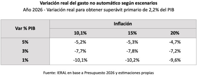 En el escenario descripto en el párrafo anterior, las erogaciones no automáticas caerían un 3,5% real anual, en lugar de aumentar un 1,4%, como se supone en el proyecto de presupuesto.