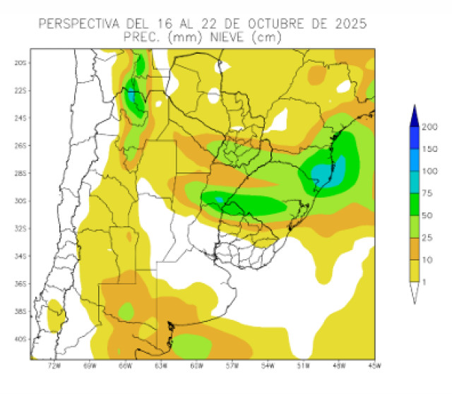 La perspectiva comenzará con temperaturas sobre lo normal, pero muy rápidamente comenzará el paso de un frente de tormenta, con una actividad muy diferencial, produciendo precipitaciones escasas en la mayor parte del área agrícola, a excepción de algunos focos aislados con registros moderados a abundantes sobre el NOA, el sudeste del Paraguay, la Mesopotamia y el norte del Uruguay, y el sudoeste de la Región Pampeana. Junto con el paso del frente, se producirá una irrupción de los vientos del sur, produciendo un marcado descenso térmico en el centro y el sur del área agrícola, aunque sin llegar a su extremo norte. La perspectiva finalizará con el retorno de los vientos del Trópico, produciendo temperaturas muy sobre lo normal en la mayor parte del área agrícola, con focos de calor intenso sobre su extremo norte, y sólo la franja costera atlántica observará registros en el rango normal.