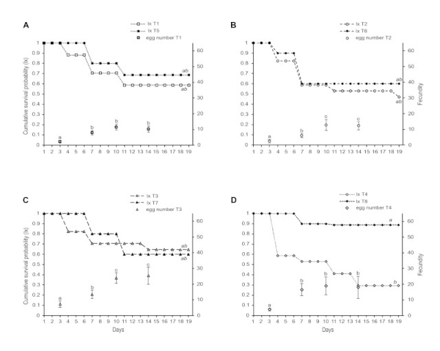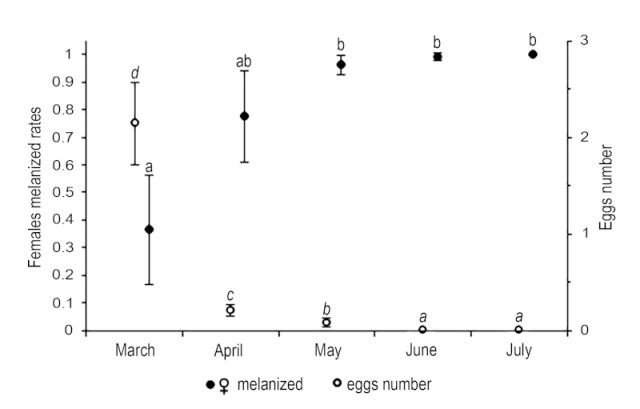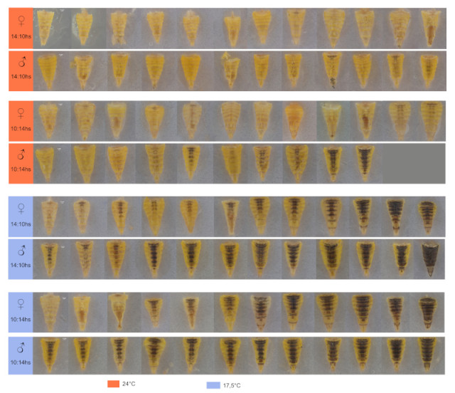 A partir de eso nos preguntamos: ¿Qué factor será el disparador para que los ovarios comiencen a madurar huevos? Apostábamos a que se trataba de una combinación de condiciones ambientales: aumento de temperatura y de fotoperíodo que le indicaban al organismo de la hembra “¡está llegando el verano y ya va a encontrar plantas de maíz, puedes empezar a madurar huevos!”. Pero nuestros experimentos sometiendo las hembras invernales a distintas combinaciones de temperatura (por ejemplo, temperatura media de fines de invierno y media de principio de verano) y fotoperíodo (de invierno y de verano) nos demostraban que aquellos individuos que manteníamos sin acceso al maíz seguían con sus gónadas en quiescencia reproductiva; mientras que todas las hembras que tuvieron acceso a plantas de maíz, incluso aquellas mantenidas en condiciones invernales (a bajas temperaturas y pocas horas diarias de luz), produjeron rápidamente huevos. Además, observamos que estas hembras no requerían copular nuevamente, dado que ya habían sido fecundadas durante el verano y aún conservaban espermatozoides viables dentro de sus espermatecas. Descubrimos que son capaces de poner huevos fértiles por más de 14 días.