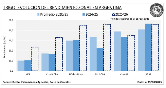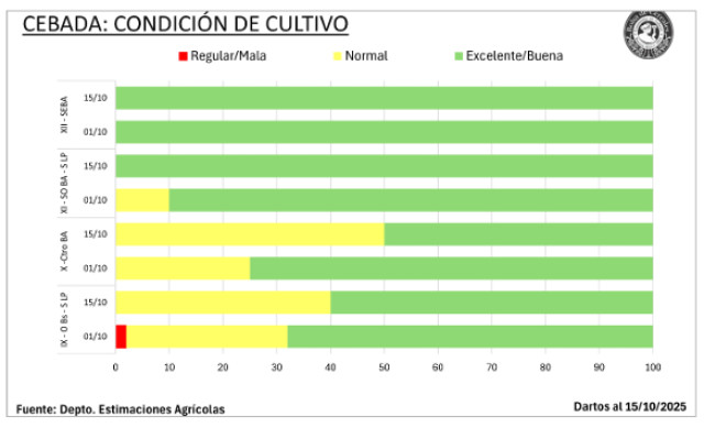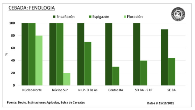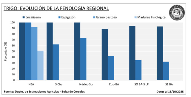 Actualmente, el 70,6 % del área transita desde espigazón en adelante, con buenas expectativas de rinde. El 72,8 % del cereal presenta condición hídrica Adecuada/Óptima, y el 89,9 % mantiene condición Buena/Excelente.