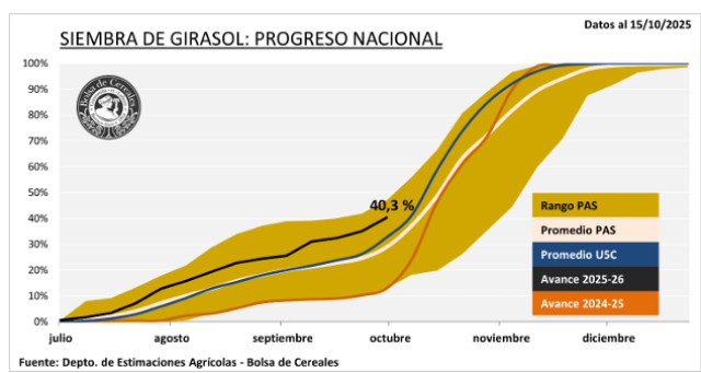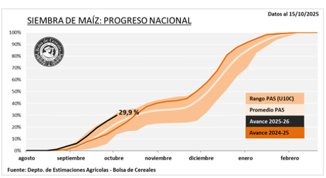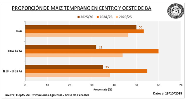 Como consecuencia de estas condiciones, se prevé que no se logren concretar los planes iniciales de siembra temprana. En este sentido, la participación de estos planteos en el total sembrado se ajusta a la baja: en el oeste de Buenos Aires, la estimación desciende del 44 % estimado en septiembre al 35 %, mientras que en el Centro de Buenos Aires cae del 59 % al 32 %. Por otro lado, en el centro del área agrícola, la siembra de maíz temprano se encuentra prácticamente finalizada, restando únicamente algunos lotes puntuales en la zona Núcleo y en Córdoba, cuya implantación se espera completar en los próximos días.