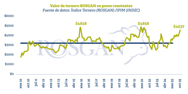 El índice de referencia para el Ternero ROSGAN alcanzó los $4.537 por kilo, lo que representa un incremento del 8,1 % frente a los valores observados en septiembre y del 47,9 % en lo que va del año. Asimismo, al analizar la serie histórica desde enero de 2010, medida en pesos constantes ajustados por inflación (IPIM), el valor actual del ternero se ubica un 40% por encima del promedio de los últimos 15 años, siendo el tercer valor más alto, solo por detrás de los máximos registrados en diciembre de 2015 y diciembre de 2021, dos períodos marcados por una fuerte inestabilidad política y cambiaria.
