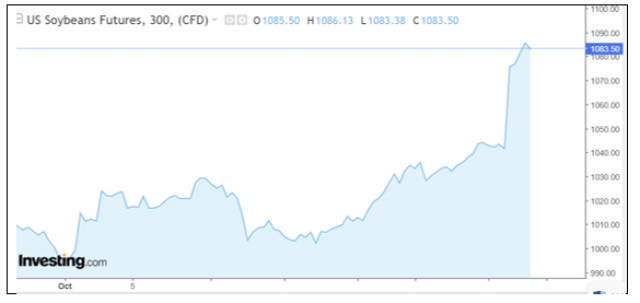 Obviamente, el alza de valores resultó de la expectativa favorable a un acuerdo de eliminación de la veda aplicada por Pekín a la oleaginosa estadounidense, por la cual China no ha comprado ni una tonelada de ésta.