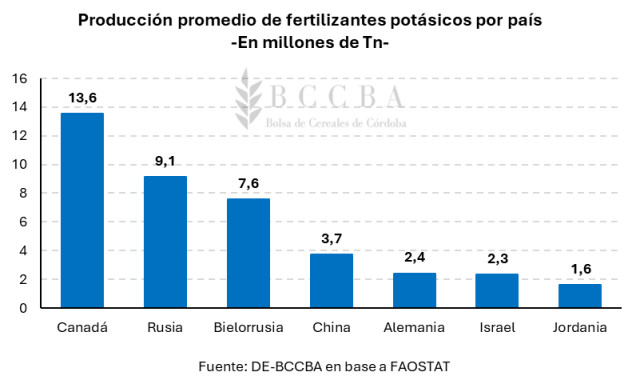 Finalmente, para el caso de los fertilizantes potásicos, el principal productor mundial es Canadá con un total de 13,6 millones de toneladas por año en promedio, seguido por Rusia con una producción de 9,1 millones de toneladas, quedando Bielorrusia en el tercer puesto con 7,6 millones de toneladas anuales.