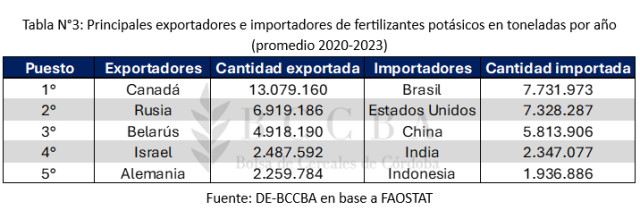 Finalmente, si de fertilizantes potásicos hablamos, Canadá es por excelencia el principal exportador con una cantidad anual promedio que ronda los 13,1 millones de toneladas. El segundo en abastecer la demanda mundial es Rusia, con una cifra de 6,9 millones de Tn. Mientras que Bielorrusia ingresa al escenario con 4,9 millones de toneladas comercializadas al exterior. Mientras que, al igual que los casos anteriores, Brasil es el importador líder del mercado de los fertilizantes potásicos, con 7,7 millones de toneladas, seguido por Estados Unidos con 7,3 millones de, mientras que China demanda 5,8 millones de Tn en promedio por año.