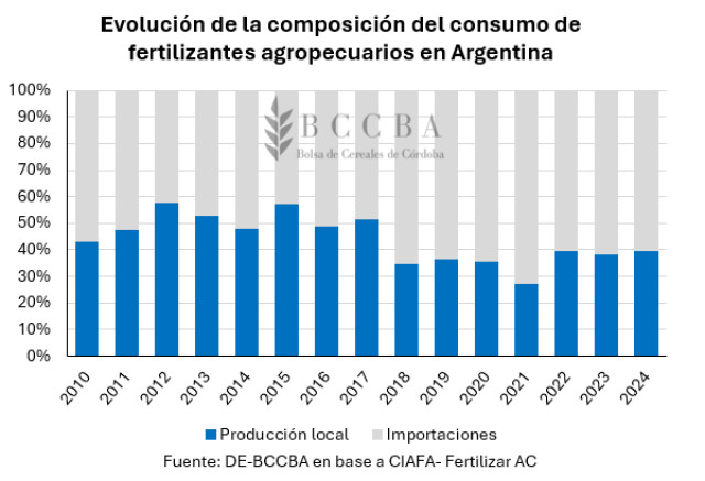 En Argentina, la producción de fertilizantes ronda los 1,7 millones de toneladas por año. El 68% de la producción corresponde al tipo nitrogenados, que se traducen en 1,1 millones de toneladas de producción anual promedio, el 25% al tipo fosfatados (unas 410 mil toneladas), 7% azufrados (129 mil toneladas) y una pequeña proporción a potásicos (3 mil toneladas). En el país hay 25 empresas productoras y distribuidoras de fertilizantes, localizadas en Buenos Aires, Santa Fe y Córdoba.