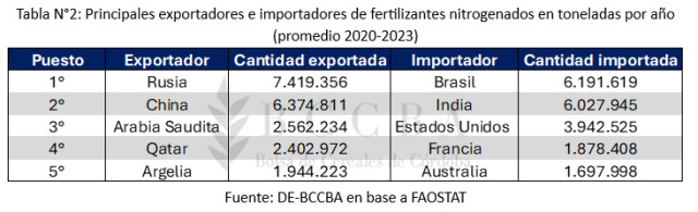 Por su parte, respecto a los fertilizantes nitrogenados, el mercado de la exportación es liderado por Rusia con 7,4 millones de toneladas vendidas por año en promedio, seguido por China (6,4 millones de Tn) y Arabia Saudita (2,6 millones de Tn). Mientras que, por el lado de los importadores, Brasil también tiene el primer puesto con 6,2 millones de toneladas demandadas, mientras que en segundo lugar queda India con 6 millones de Tn importadas, y por detrás Estados Unidos con 3,9 millones de Tn.