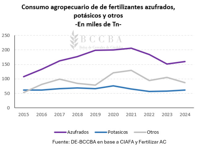 En cuanto a los fertilizantes azufrados, entre los que se destacan el sulfato de amonio, tiosulfato de amonio (TSA), yeso agrícola y mineral, en los últimos 10 años se ha consumido un total de 1,7 millones de toneladas, lo que implica un promedio anual de 168 mil toneladas, mientras que los potásicos (Cloruro de Potasio – Nitrato de Potasio – Sulfato de Potasio – TSK (Tiosulfato de potasio) se han utilizado 642 mil toneladas, que implicaría un promedio anual de 64 mil toneladas. A diferencia de los otros fertilizantes, el año con la mayor cifra empleada fue el año 2020 (75 mil toneladas).