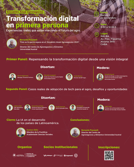 Formulario online: https://www.austral.edu.ar/encuentro-anual-agronegocios-transformacion-digital-en-primera-persona/