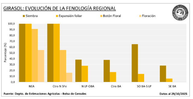 No obstante, la mayor parte de los cultivos se encuentra transitando estadios vegetativos entre V4 y V8. Por su parte, la siembra de girasol ya cubre el 63 % de las 2,7 MHa proyectadas, luego de un progreso intersemanal de 11,8 p.p. Si bien las lluvias del pasado fin de semana generaron algunas demoras en el centro y oeste bonaerense debido a la falta de piso, en el centro y norte del área agrícola, donde la siembra está prácticamente finalizada pero la humedad disponible comenzaba a ser limitante, estos aportes resultaron beneficiosos para acompañar el desarrollo de la oleaginosa, sobre todo del 12,4 % del área que transita entre botón floral y floración. A la fecha, el 81,4 % del área en pie presenta condición hídrica Adecuada a Óptima, y el 96,9 % mantiene condición de cultivo Normal a Excelente.