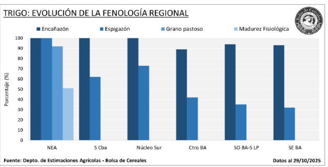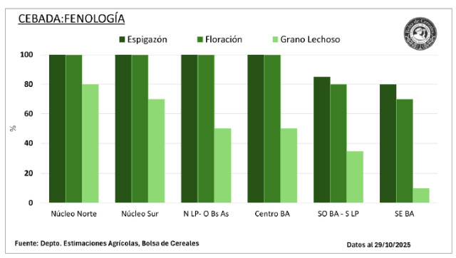 Algo similar ocurre en el cultivo de cebada. Como se mencionó anteriormente, se dieron heladas tardías que abarcaron el sur y oeste bonaerense. Estos episodios podrían afectar los componentes del rendimiento, dado que el cultivo transita etapas fenológicas sensibles. Sin embargo, la elevada humedad ambiente podría haber contribuido a atenuar el posible impacto de las bajas temperaturas, por lo que resulta necesario aguardar la evolución de los cultivos para dimensionar con mayor precisión el efecto real. Bajo este escenario, se mantiene la proyección de producción en 5,3
