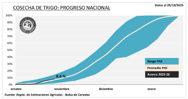 Tras un progreso de 3,1 p.p., la cosecha cubre el 8,4 % del área apta con un rinde promedio de 20,3 qq/Ha. A la espera de la evaluación del efecto de las heladas, la proyección de producción se mantiene en 22 MTn.