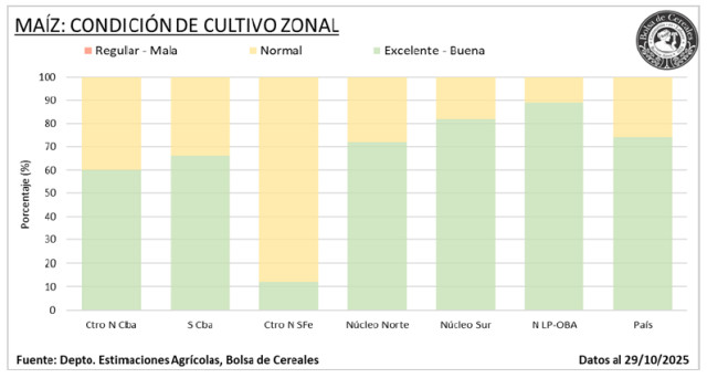 En estas zonas, excesos hídricos provocados por las tormentas del pasado fin de semana, han condicionado el ritmo de las labores, reduciendo la proporción de siembras tempranas respecto a campañas anteriores. En cuanto al estado de los cultivos ya implantados, la mayoría de los lotes presentan una condición entre Normal y Buena, reflejando un adecuado establecimiento inicial en las regiones donde las condiciones climáticas han sido favorables. Por su parte, en el Centro-Norte de Santa Fe, comienzan a observarse los primeros lotes en etapa de panojamiento (VT).