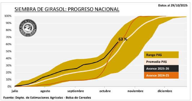 Pese a las lluvias, la siembra marcó un progreso intersemanal de 11,8 p.p. y ya cubre el 63 % de las 2,7 MHa proyectadas. El 96,9 % del área presenta condición de cultivo Normal a Excelente y un 12,4 % transita botón floral.
