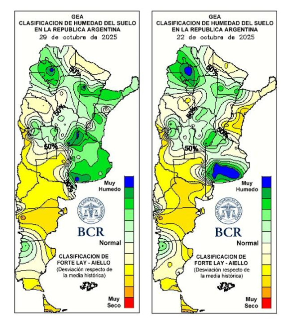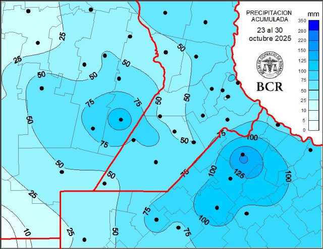 La media mensual del mes suele estar en la región núcleo entre 75 a 100 mm, y termina con 105 mm como media de las 36 estaciones de la red GEA/BCR. Con una particularidad, el 60% de las lluvias mensuales se acumularon en las lluvias del último fin de semana, sumando la actividad del viernes pasado. El agua era requerida para afianzar el llenado del trigo, sobre todo en la franja este, dónde se esperaban entre 50 y 60 mm para transitar sin déficits la última etapa que definirá el peso del grano. La tormenta cumplió con creces, los acumulados estuvieron entre 30 y 160 mm. El máximo valor se registró en Pergamino.