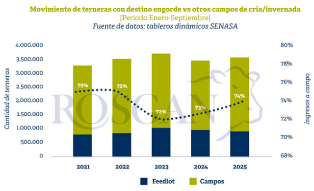 En este sentido, al observar lo sucedido dos años atrás, en 2023, vemos que el porcentaje de terneras que, habiendo salido de los campos de cría, continuó fuera de los corrales de engorde había caído significativamente del 75% al 72%. Curiosamente, esta caída estuvo mucho más asociada al contexto político de ese momento —pleno año electoral— que a factores climáticos, que sí habían sido mucho más críticos en 2022.