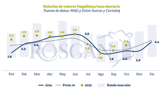 En otras palabras, reponer un vientre nuevo tendría un costo equivalente a 2,2 vacas de refugo, mientras que hace un año esta relación era de 2 a 1, en línea con el promedio histórico para este mes.