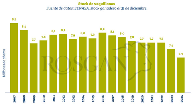 Puntualmente, en todo 2023 se faenaron más de 4 millones de vaquillonas, es decir, el 52,5% del stock inicial de 7,7 millones, y a fines de ese año el stock disminuyó en más de 300 mil cabezas. En 2024, el total faenado prácticamente no se modificó, pero, considerando un stock menor, esto implicó una extracción del 54,6%, lo que se reflejó en la reducción del stock en casi 500 mil cabezas.