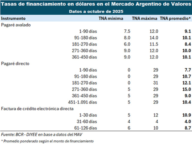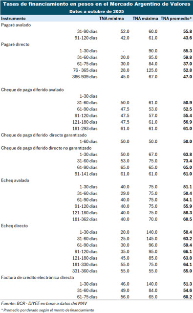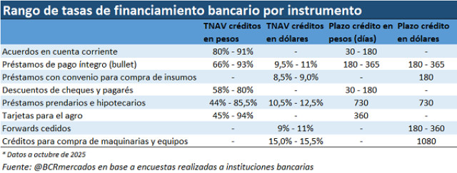La siguiente tabla resume, para cada instrumento y plazo, la banda (límite mínimo y máximo) y una tasa promedio de mercado, ponderada por el monto nominal que se financió a cada tasa. Los datos corresponden a la semana finalizada el 24 de octubre de 2025. Cabe mencionar que este es un relevamiento general de tasas, el cual no se encuentra discriminado específicamente para el financiamiento al sector agro, sino que contemplan la totalidad de los créditos otorgados. A pesar de esto, constituye una referencia relevante, ya las tasas a las que efectivamente puedan financiarse los productores se encontrarán dentro de las bandas presentadas.