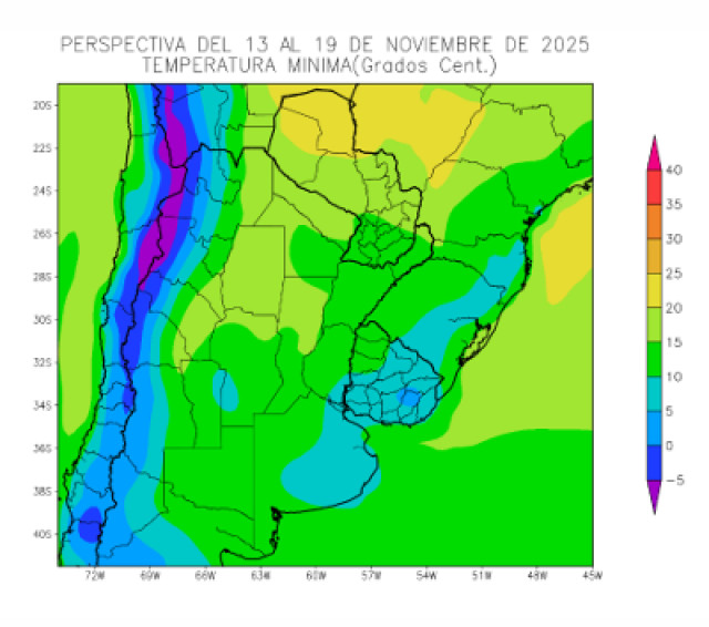 El centro-este del NOA, el centro de Cuyo, la mayor parte de Buenos Aires y gran parte del Uruguay observarán temperaturas mínimas entre 5 y 10°C, con riesgo de heladas localizadas. Las zonas serranas y cordilleranas del NOA, del Cuyo y el centro-este del Uruguay observarán temperaturas mínimas bajo 0°C, con heladas generales y un foco con valores de -5°C sobre el NOA.