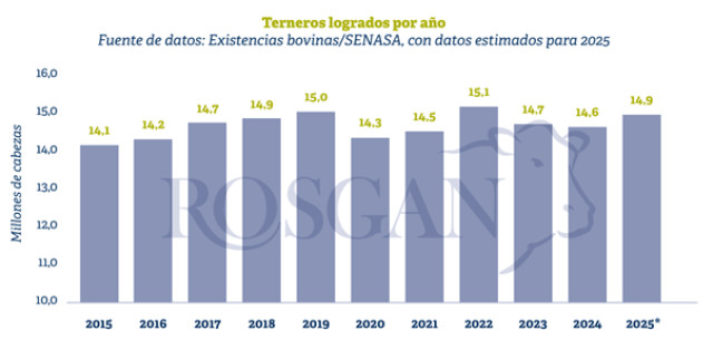 La cantidad de terneros logrados prácticamente no ha crecido en los últimos diez años. El año pasado se contabilizaron unos 14,6 millones de terneros y terneras dentro del stock oficial, la misma cifra que un año atrás, aunque obtenida con un menor número de vientres.