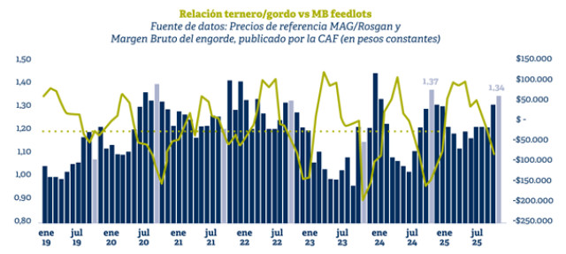 No obstante, al analizar en retrospectiva ambas series — es decir, la relación de compra-venta y la serie de margen bruto de la actividad, medida en moneda constante— se observa que, a pesar de lo encarecida que se presenta actualmente la relación ternero-gordo (que para octubre se ubica en 1,34 frente a un promedio histórico de 1,25 para ese mismo mes), la situación actual en términos de margen bruto resulta menos desfavorable que la registrada en los últimos dos años.