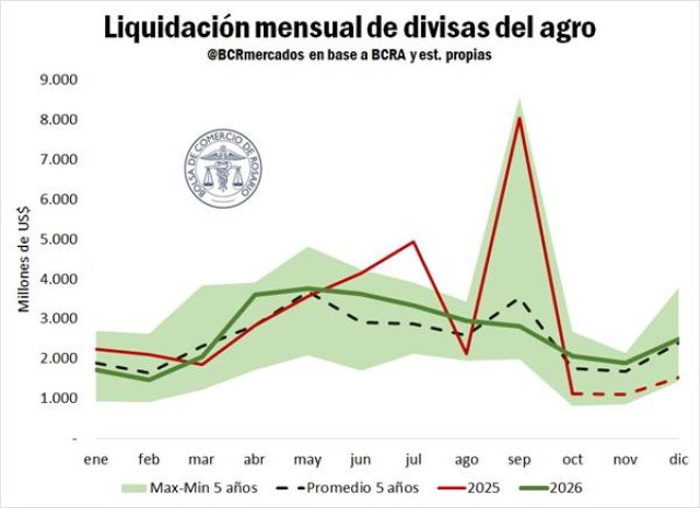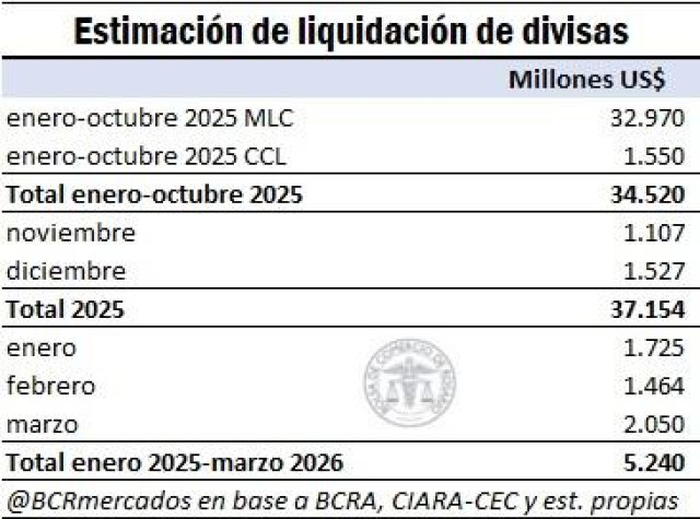 Para los dos meses restantes, se estima que la liquidación en el Mercado de Cambios sume US$ 2.600 millones, por lo que el año 2025 se proyecta que cierre con US$ 37.150 millones liquidados por el sector entre todos los mercados de cambios.