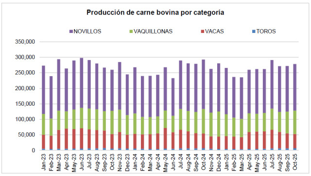 La producción de carne bovina del mes de octubre de 2025 alcanzó las 278,6 mil toneladas res con hueso, incrementándose en cerca de 6,4 mil toneladas con respecto al mes anterior, y exhibiendo una moderada caída, de 14,2 mil toneladas, con respecto al mes de octubre del año 2024. En los primeros diez meses del año 2025, la producción de carne bovina alcanzó los 2,636 millones de toneladas equivalente res con hueso; situándose 1,3 mil toneladas por encima del acumulado del período enero a octubre de 2024, que había ascendido a 2,634 millones de toneladas equivalente res con hueso.