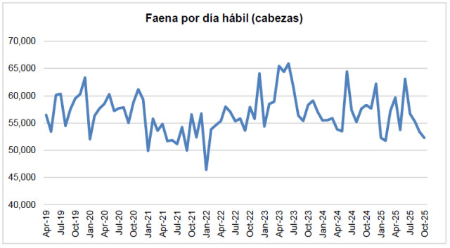 La faena diaria del mes de octubre del corriente año, se ubicó en 52,2 mil cabezas, un (-2,1%) por debajo de las 53,4 mil diarias procesadas en septiembre, y un (-10,4%) inferior a las 58,3 mil correspondientes a octubre de 2024.