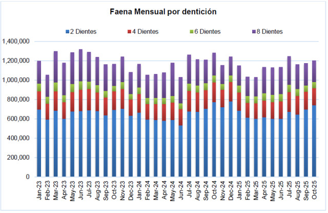 En los primeros diez meses del año 2025, se faenaron 11,40 millones de bovinos; un (-1,2%) menos que los 11,53 millones que se habían faenado entre enero y octubre de 2024. Las mayores diferencias interanuales en la faena provienen de las hembras de ocho y más dientes, que recortaron en 79,4 mil cabezas la faena acumulada en los primeros diez meses del año pasado, las hembras de seis dientes, que mostraron una caída interanual de la faena cercana a las 132,0 mil cabezas, y, por los machos de cuatro dientes, cuya faena disminuyó en cerca de 34,7 mil cabezas a la registrada entre enero y octubre del año 2024; en sentido contrario, se incrementó la faena de hembras de dos dientes en aproximadamente 124,7 mil cabezas, y la de novillos de seis dientes en 46,5 mil cabezas.