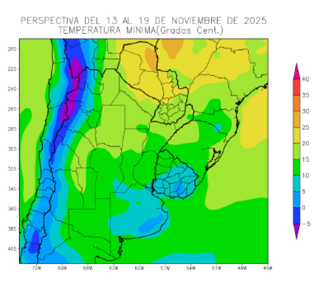El nordeste del NOA, la Región del Chaco, el norte y el centro de la Mesopotamia, el noroeste del Uruguay y la mayor parte del Paraguay observarán temperaturas mínimas superiores a 15°C, con un foco con valores superiores a 20°C y otros focos con valores inferiores.