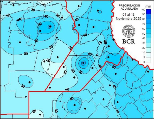 La primera quincena de noviembre se caracterizó por aportes de agua cada 4 o 5 días que trabaron la siembra de soja. El 75% de la región acumuló mas de 30 mm en ese tiempo. Chovet acumuló 69 mm; Bell Ville, 64 mm y Santa Teresa, 56 mm. En los ultimos 7 días, Chovet y Santa Teresa acumularon 49 y 36 mm, espectivamente. El noroeste de Buenos Aires y el extremo sur de Santa Fe fueron las zonas con los menores milimetrajes en lo que va del mes. Incluso, en los ultimos 7 días, los montos estuvieron por debajo de los 5 mm.