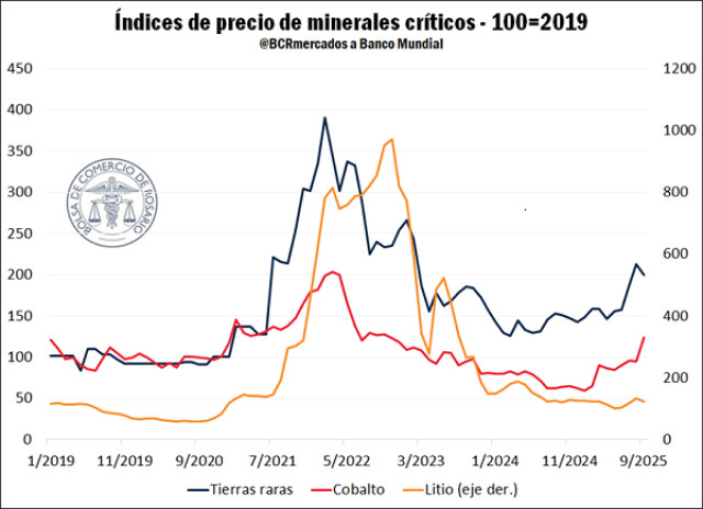 En el caso de los minerales críticos, tanto las tierras raras como el cobalto registraron una recuperación importante de precios sobre el final de 2025. Para el caso del litio registró un alza del 18% en el tercer trimestre de 2025, impulsado por el endurecimiento de las regulaciones mineras en China. A pesar de esto, la perspectiva de precios a corto plazo se mantiene contenida por la continua expansión de la oferta, aunque se espera un alza a largo plazo a medida que la demanda estructural (energía limpia, electrónica, IA) supere la oferta.