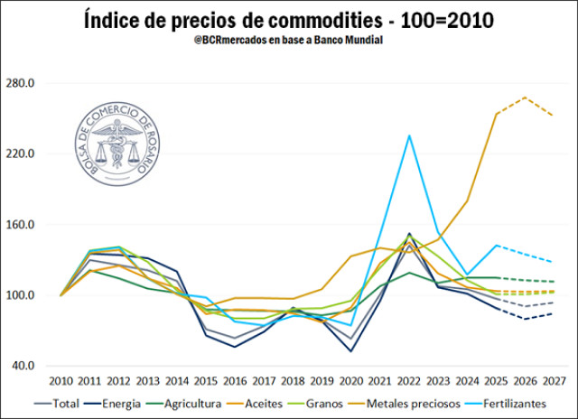 El índice agregado de precios de commodities proyecta una contracción del 7,4% en 2025. Este descenso se atribuye fundamentalmente a una actividad económica mundial moderada, tensiones comerciales e incertidumbre política y una amplia oferta mundial de petróleo. Se anticipa una caída adicional del 6,8% en 2026, marcando el cuarto año consecutivo de declive. El pronóstico para 2027 indica una recuperación parcial del 3,6%.
