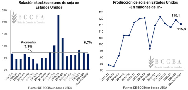 Además, el organismo estadounidense proyecta una caída del 7,6% en los stocks iniciales respecto al ciclo 2024/25 y, a su vez, estima el consumo interno en alrededor de 72,5 millones de toneladas (+4,4% intercampaña). No obstante, el volumen de exportaciones esperadas se redujo en 1,4 millones de toneladas posicionándose en 44,5 millones de toneladas e implicaría una caída intercampaña del 13%. Esto último quitaría presión sobre los stocks finales, sin embargo, el volumen estimado de los mismos se redujo en un 3,4% respecto al dato de septiembre y rondaría los 7,9 millones de toneladas (-8,3% intercampaña). De esta manera, la relación stock/consumo se posicionaría en un 6,7%, reduciéndose levemente respecto al informe previo (6,9%) y continuaría por debajo del promedio de las últimas 18 campañas (7,3%).