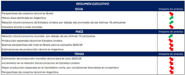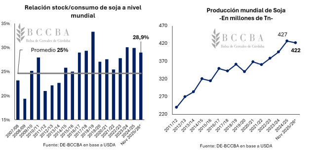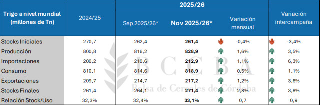 En base a lo anterior, en el plano mundial se espera un aumento de la producción -la cual continúa situándose como récord- de 12,7 millones de toneladas respecto a lo estimado previamente, lo que la ubicaría en 828,9 millones de toneladas. Aunque el consumo total aumente, lo haría en menor magnitud, por lo que los stocks finales se incrementarían en 7,4 millones de toneladas intermensual, dando como resultado un aumento de la relación stock consumo, quedando dos puntos porcentuales por encima del promedio.
