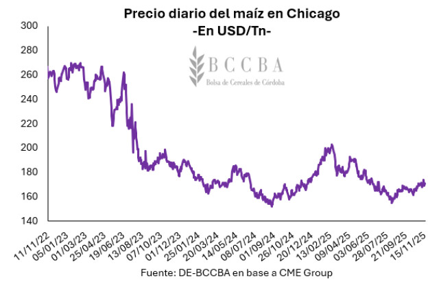 En cuanto al precio, el maíz en Chicago cotiza en torno a los USD 170,5/Tn en lo que va de noviembre, exhibiendo una suba intermensual del 2%. No obstante, este valor se encuentra en línea a lo observado en noviembre del año previo reflejando el comportamiento lateral del precio en la plaza internacional.