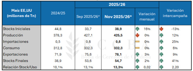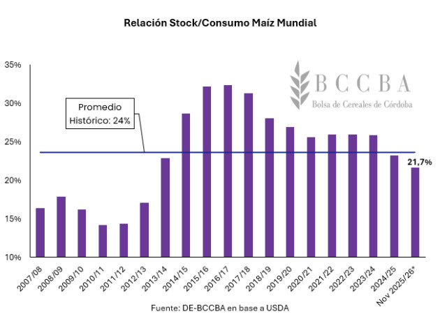 El USDA en su reporte de noviembre no ha realizado modificaciones significativas en la hoja de balance de maíz a nivel mundial respecto a su última estimación. En este sentido, continúa proyectando como récord la producción de maíz de la campaña 2025/26 en 1.286,2 millones de toneladas. Por el lado del consumo y los stocks finales se mantendrían en alrededor de 1.296,5 millones de toneladas (+3,3% intercampaña) y 281,3 millones de toneladas (-3,5% intercampaña), respectivamente. El mayor cambio se lo llevan los stocks iniciales que exhibirían una caída respecto a la campaña pasada del 7,5%, ubicándose en 291,7 millones. Dado esto, el resultado de la relación stock/consumo se posicionaría en 21,7% (-6,7% intercampaña), ubicándola como la menor de los últimos trece años y 2,3 puntos porcentuales por debajo del promedio histórico.