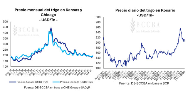 En lo transcurrido de noviembre, el precio promedio del trigo en Chicago se sitúa en USD 198/Tn, un 4% por debajo del precio de noviembre del año pasado, donde se situaba en USD 205/Tn. En Kansas, el cereal cotiza en USD 194/Tn, lo que representa una caída interanual en el orden del 5%. A nivel local, el trigo continua su tendencia bajista cotizando USD 183/Tn, una caída interanual del 4% que podría ser explicado por los altos volúmenes materializados.
