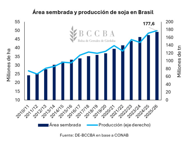 En Brasil, la Compañía Nacional de Abastecimiento (CONAB) prevé más de 49 millones de hectáreas destinadas a la soja, lo cual implicaría un aumento del 3,6% en comparación al ciclo 2024/25. Mientras que, de darse un rinde similar al observado durante el ciclo previo (36,2 qq/ha), la producción podría alcanzar un récord histórico de 177,6 millones de toneladas (+3,6% intercampaña).