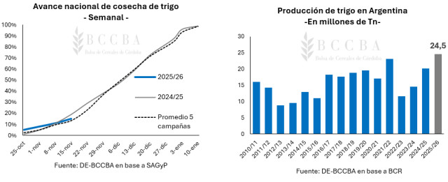 En cuanto a la producción, la BCR aumentó su proyección en 1,5 millones de toneladas respecto al mes previo por lo que se esperaría obtener un volumen récord para la campaña 2025/26 de 24,5 millones de toneladas. Por su parte, se alcanzaría un rendimiento promedio de 37,7 qq/ha, debido a las buenas condiciones de humedad con la que se inició la siembra más las lluvias que acontecieron en momentos clave del desarrollo del cereal. Tanto para Buenos Aires, como para Córdoba y Santa Fe se esperarían rendimientos récord.
