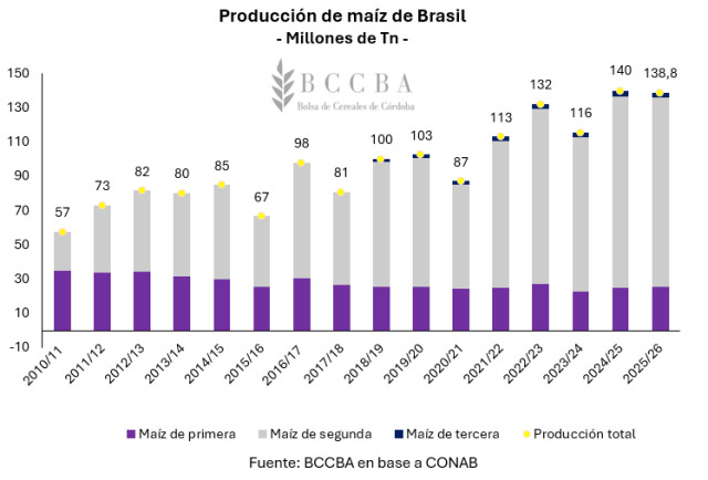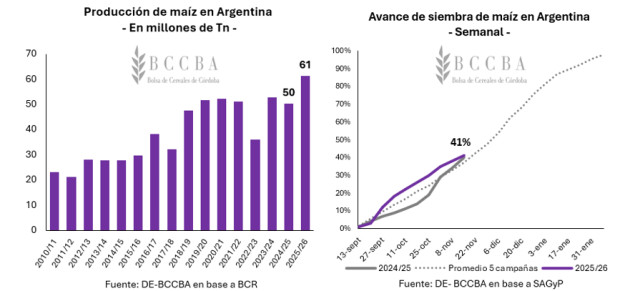 En Brasil, la CONAB proyecta una producción total de maíz de 138,8 millones (1% por debajo al récord del ciclo previo) para la campaña 2025/26. Este resultado se explicaría por una suba del área sembrada (+4% por encima al ciclo previo), mientras que los rendimientos esperados alcanzarían los 61 qq/ha (3,5 qq/ha por debajo del ciclo previo). A mediados de noviembre, las labores de siembra del maíz de primera presentan un avance en línea al promedio (56%) y cuya producción estimada rondaría los 25,8 millones de toneladas.