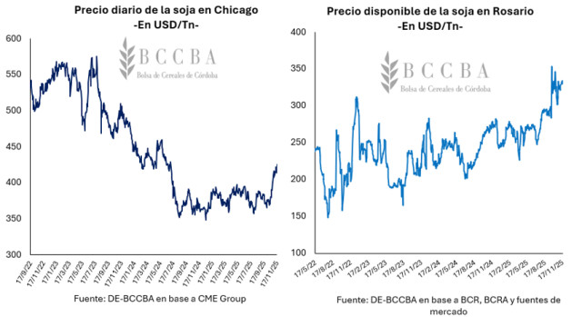En lo que va del mes, el precio de la oleaginosa en Chicago promedia los USD 415,5/Tn, USD 32/Tn por encima del promedio operado en octubre (+9% intermensual) y un 13% por encima de la cotización observada en noviembre del 2024 (USD 366,7/Tn). De esta manera, el precio ha logrado superar una importante zona de resistencia en un contexto de escasez informativa debido al “shutdown” y un acuerdo comercial alcanzado con China. En este sentido, se han observado compras por parte del país asiático de soja estadounidense, mercado del cual había estado prácticamente ausente previo al acuerdo. Por lo tanto, si bien el precio en Chicago recupera, no es de esperar que las subas se trasladen de igual manera a Sudamérica, ya que se beneficiaron con embarques de soja que no eran realizados por los norteamericanos, sosteniendo el valor local.