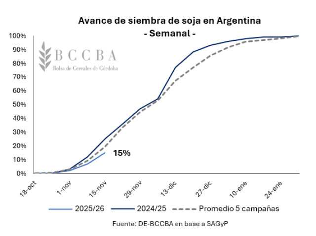 Por el lado de Argentina, la Secretaría de Agricultura, Ganadería y Pesca de la Nación (SAGyP) proyecta un área sembrada de soja que alcanzaría las 17,5 millones de hectáreas durante el ciclo 2025/26, implicando una caída del 3% respecto a la campaña previa (18 Mill Ha). Con lo cual, de darse un rendimiento en torno al promedio, la producción rondaría los niveles observados durante las últimas campañas (47-50 millones de toneladas). A la fecha, la siembra presenta un avance del 15% a nivel nacional, exhibiendo un retraso de 10 puntos porcentuales en comparación al ciclo previo.
