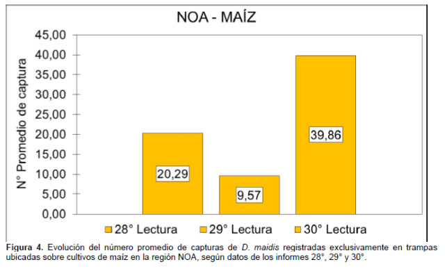 En el NOA, pese a tratarse de una zona endémica, la población de D. maidis mostró una estabilidad poblacional en esta evaluación. En el 56% de las localidades monitoreadas no se registraron adultos (0/trampa), mientras que en el 27% restante las capturas se mantuvieron en niveles de mera presencia (1 a 4 adultos por trampa) .