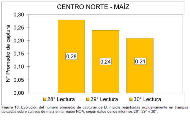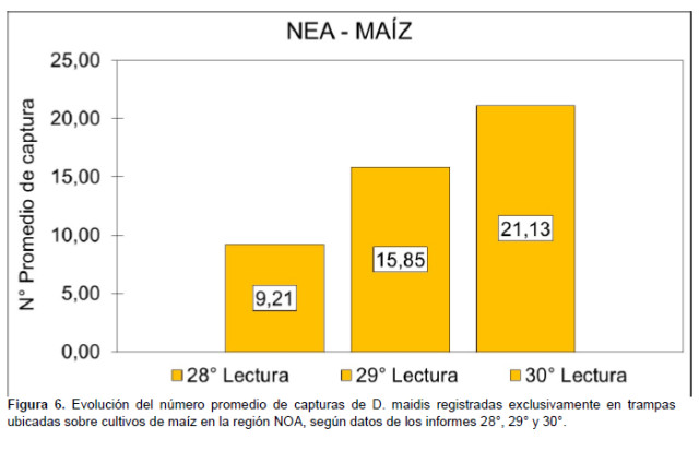 Aproximadamente el 40% de las trampas incluidas en este relevamiento (correspondientes a 29 localidades) se encuentran instaladas sobre maíces implantados en fechas tempranas, observándose un ligero incremento en los niveles promedio de adultos de D. maidis capturados con el avance de los monitoreos. En esta región será fundamental el seguimiento de la evolución del vector, especialmente de cara a la posterior siembra del maíz tardío.