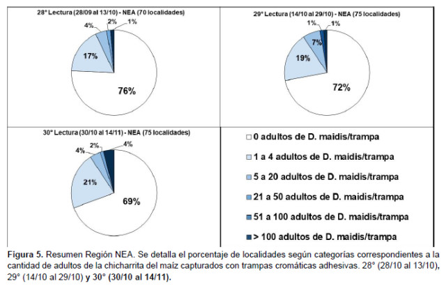 Para cada región se evaluó cómo evolucionaron las capturas utilizando dos enfoques: un gráfico de torta para representar el resultado de todas las trampas y un gráfico de barras para mostrar únicamente las trampas instaladas en lotes de maíz. Para este análisis se consideraron solo las localidades que tuvieron cultivo de maíz en los últimos tres relevamientos (informes 28, 29 y 30). De este modo, se describió la evolución de los valores de captura de D. maidis en sitios con presencia efectiva del cultivo.
