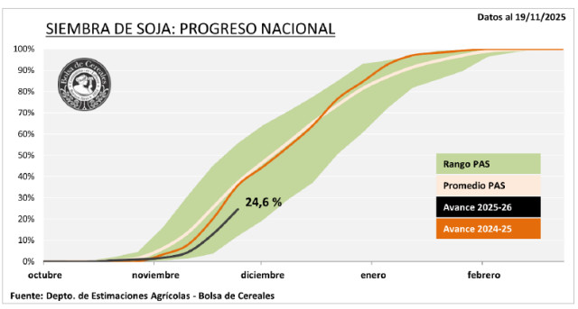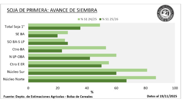 Tras un progreso intersemanal de 12 p.p. la oleaginosa cubre el 24,6 % de las 17,6 MHa proyectadas, registrando una demora interanual de 11 p.p. A su vez, se ha sembrado el 35,6 % de la intención de siembra de soja de primera.
